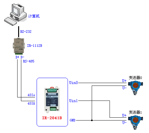 典型应用:计算机通过RS-485与IR-2041B连接实现对温度信号的采集